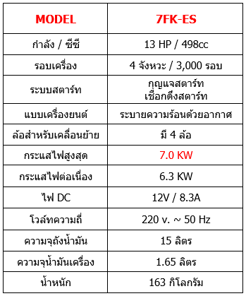 กระแสไฟฟ้าได้กำลังสูงถึง 7,000 วัตต์ ที่ 220 โวลท์ มีถังจุเชื้อเพลิงขนาด 15 ลิตร สามารถใช้ไฟฟ้าได้ 2 แบบคือ AC 220V และสามารถใช้ชาร์จแบบเตอรี่ DC 12V(8.3A) ได้